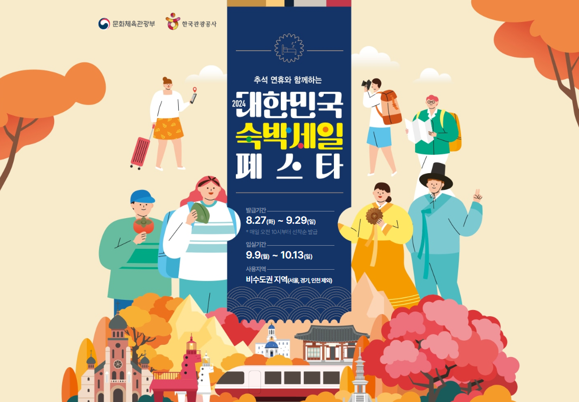 추석 연휴 "2024 대한민국 숙박세일 페스타"가 8월 27일 오전 10시부터 시작됩니다. 한국관광공사가 주최하는 비수도권 지역 국내 숙밥업소에서만 사용가능한 3만 원, 2만 원 사용 가능한 쿠폰입니다. 한정된 수량으로 선착순 20만 장만 발급되오니 소진 시 조기 종료 되기 전에 빨리 서두르세요.